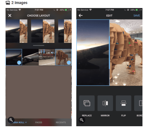 - بمجرد تحديد الصور يعرض لك التطبيق العديد من القوالب أو التركيبات للحصول على صورة مدمجة على حسب رغبتك.